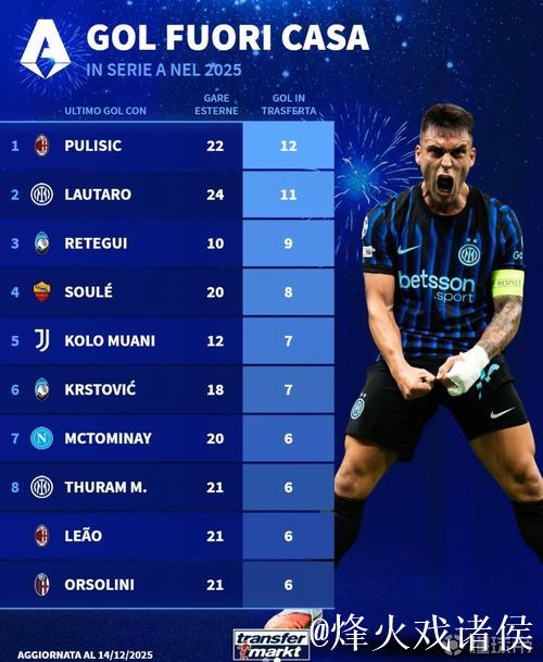 2025年意甲球员客场进球榜:普利希奇居首12球,劳塔罗11球紧随其后